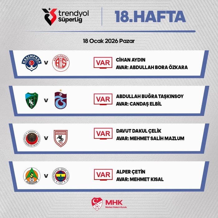 Trendyol Süper Lig’de verilen ortanın akabinde heyecan 18. haftasında devam ediyor. Merkez Hakem Kurulu (MHK), 18 Ocak Pazar günü oynanacak olan karşılaşmaların (Kasımpaşa-Hesap.com Antalyaspor, Kocaelispor-Trabzonspor, Gençlerbirliği-Samsunspor ve Corendon Alanyaspor-Fenerbahçe) VAR ve AVAR hakemlerini açıkladı.